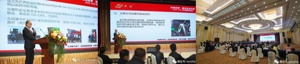 质量技术研发代表张圣磊先生从公司的研发试装、厂商合作和2020年中良胶带三包情况等三个方面做了质量技术报告。他指出,2020年中惠公司质量部门不断突破、不断创新,SB包布带项目、SC齿形带项目成功完成目标要求,产品质量更加可靠;三元乙丙胶齿形带HM2640和4HB1941开发成功,并在东北玉米收(倒伏多)验证,效果理想,可以长时间耐高温。开发了9J金标齿形带、7HC金标齿形带等多联组带,使用效果很好。HN/HO等大功率齿形带验证完成,已安排批量生产。此外公司还联合沃得农机、中联重机、美国凯斯纽荷兰、德国克拉斯、日本久保田等多个厂家进行疲劳验证试验和技术交流,不断对自己的产品进行更新换代,并就2020年市场出现的三包胶带进行了数据分享和质量报告分析。
